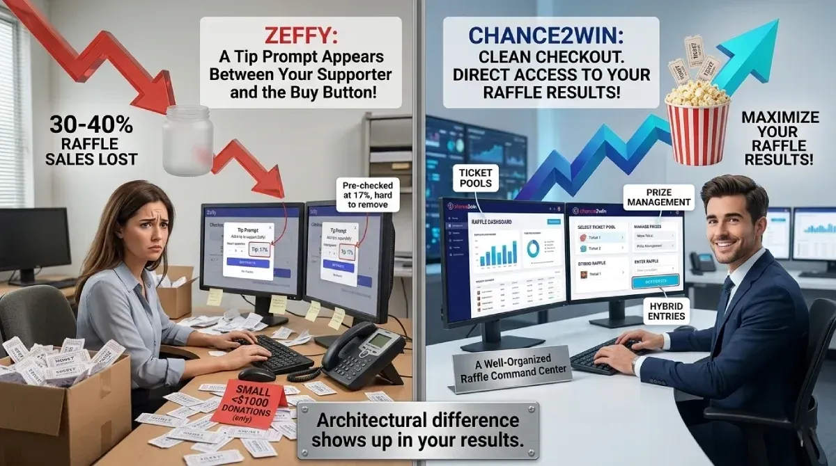 Compliance note: Raffle laws vary significantly by state, and some states require fixed, upfront price disclosure for regulated raffle entries. Chance2Win’s fixed service fee model is designed with this in mind. Zeffy’s variable tip model may present compliance questions in some jurisdictions. This is informational — not legal advice. Always consult a qualified attorney and your state’s charitable gaming authority before launching any raffle.